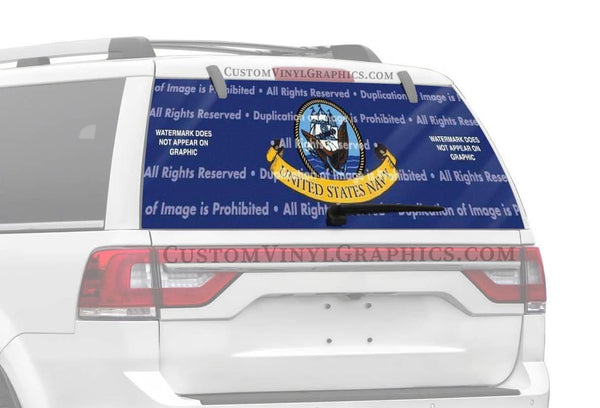 This US Navy 2 rear window decal features a dark blue background with a naval seal in the center and a United States Navy banner at its base. This graphic is a great way to show your pride, support and respect for all those who serve their country in the US Navy. Or, if you are a proud parent, this graphic would be a nice way to pay tribute to the service and your pride in your son or daughter's service in the United States Navy.